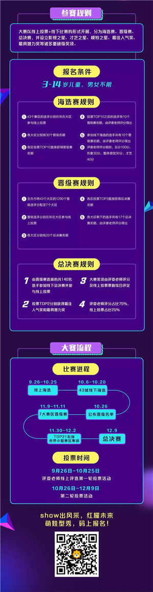 每個(gè)孩子都有一個(gè)舞臺(tái)的夢(mèng)想,每個(gè)孩子的夢(mèng)想都值得被尊重。無(wú)論是一首小小的兒歌,還是一段簡(jiǎn)單的舞蹈,抑或一場(chǎng)自信的走秀,都是孩子們極具天賦的才藝。如果你是一位尊重孩子天性發(fā)展的家長(zhǎng),如果你希望TA能在國(guó)際舞臺(tái)上一展風(fēng)采,那么,別猶豫,舞臺(tái)已就位,敢show敢紅,C位星萌娃未來(lái)可期!