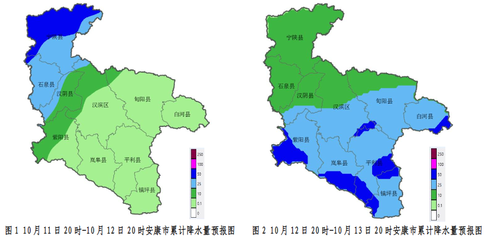 10月12日:全市大部陰天轉(zhuǎn)大雨(25~45毫米),紫陽大部、嵐皋南部、平利中南部、鎮(zhèn)坪、漢濱南部、白河局地有暴雨(超過50毫米),過程期間局地伴有雨強(qiáng)超過10毫米/小時(shí)的強(qiáng)降水;