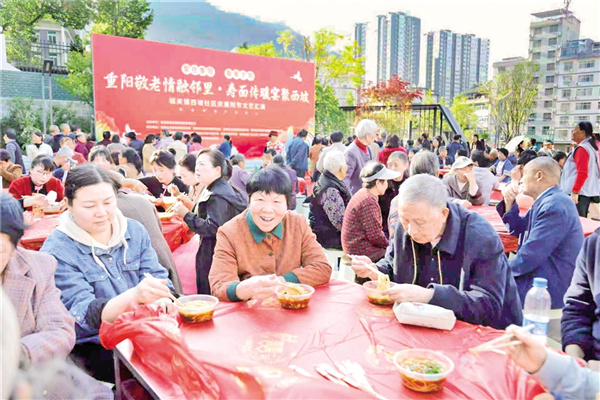 10月28日,嵐皋縣城關鎮西坡社區舉辦了“重陽敬老情融鄰里·壽面傳暖宴聚西坡”主題活動。廖霖 攝
