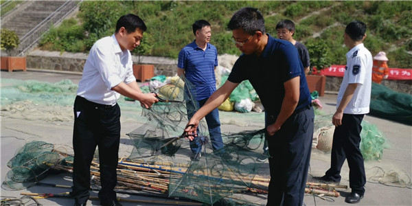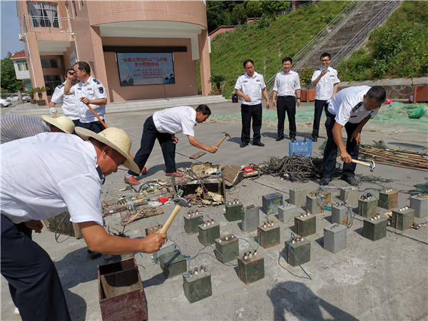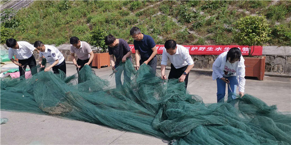 5月22日上午,陜西省農業農村廳漁業漁政局、安康市農業農村局在瀛湖海事碼頭聯合開展禁用漁具及“三無”漁船銷毀活動,集中銷毀了570余副“絕戶網”共1萬余米,銷毀電魚設備21套。