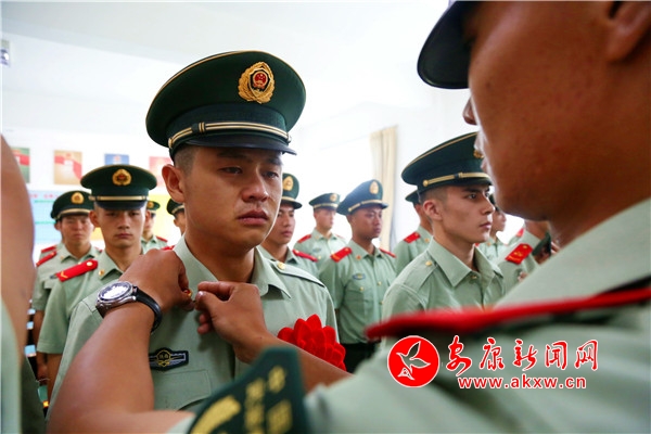 “為滿服役期士兵卸軍銜……”離隊前,留隊戰友為退伍老兵卸下警銜、領花、帽徽和胸標,為他們戴上“光榮花”。此時此刻,訓練場上的汗流浹背、執勤路上的日曬雨淋、比武場上的斬金奪銀、戰友之間的情同手足,一幕幕,一幀幀,如此真切,如此清晰,一切的一切都成了最美好的回憶。“我舍不得這心愛的紅肩章、綠迷彩。”退伍老兵馮歡看著卸下的肩章潸然淚下。