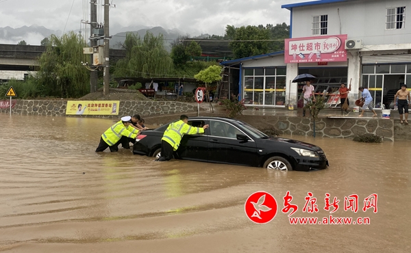 8月22日,紫陽縣漢王鎮普降大暴雨,漢王鎮上街道因雨量大發生洪水內澇,直接威脅街道居民住戶生命財產安全。轄區民警立即組織群眾用木板擋住洪水,防止洪水進入居民樓浸泡發生房屋垮塌,同時冒著危險將街道下水道井蓋掀開,分流泄洪。