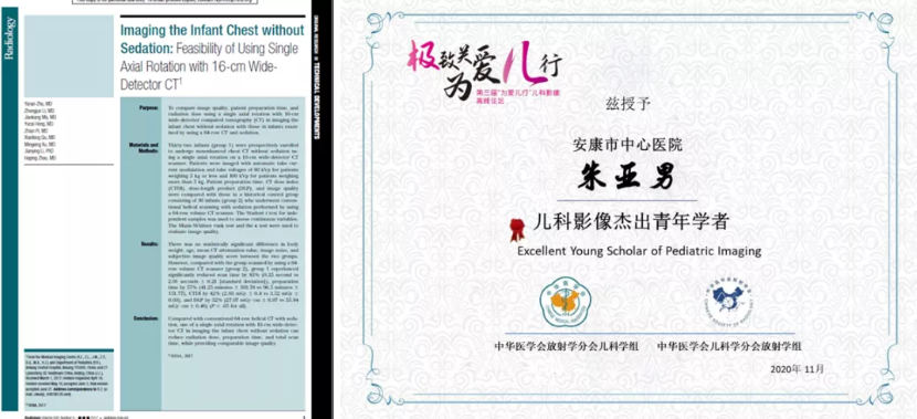 第一次RSNA投稿的成功讓他們備受鼓舞,但他們并沒有沾沾自喜,回國后朱主任立刻抓住時機,加大推進RSNA投稿摘要的英文文章的轉化過程。但轉化的過程并不順利,前后經歷了共十幾次修稿,2018年1月,文章終于被世界最頂級的放射學雜志《Radiology》收錄發表。這是全國第一篇利用Revolution CT發表在《Radiology》上的文章,朱亞男主任(醫學影像學博士)也因此在2020年獲得了中華醫學會放射學分會兒科學組和中華醫學會兒科學分會放射學組授予的“兒科影像杰出青年學者”的稱號。