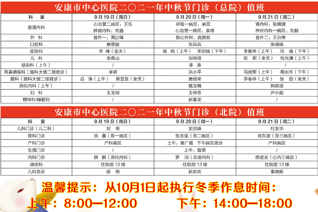 本網訊(通訊員 黃申奧)2021年農歷中秋佳節將至,為保障人民群眾身體健康,方便群眾節假日期間就醫就診,安康市中心醫院、安康市人民醫院、安康市中醫醫院等陸續發布中秋假期放假通知及門診排班安排。