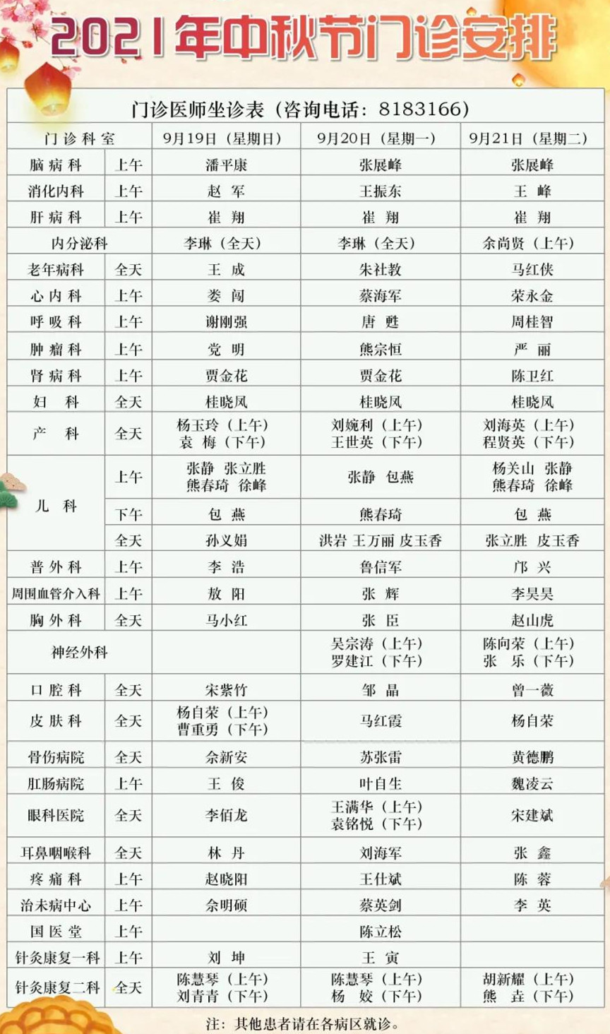 經醫院研究決定,9月19日(星期日)至21日(星期二)中秋節放假調休3天,9月18日(星期六)正常上班,執行周一門診排班。