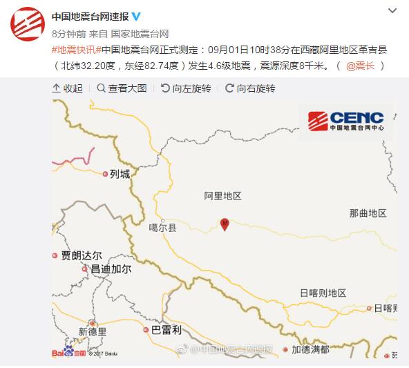 人民網北京9月1日電 據中國地震臺網正式測定,9月1日10時38分在西藏阿里地區革吉縣(北緯32.20度,東經82.74度)發生4.6級地震,震源深度8千米。