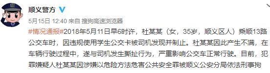 5月15日午間,北京市順義區警方發布了情況通報。5月11日早6時許,35歲的順義區女子杜某某在乘順13路公交車時,因違規使用學生公交卡被司機發現并制止。杜某某因此產生不滿,在車輛行駛過程中,遂與司機發生撕扯行為,嚴重影響公交車正常行駛。目前,犯罪嫌疑人杜某某因涉嫌以危險方法危害公共安全罪被順義公安分局依法刑事拘留。