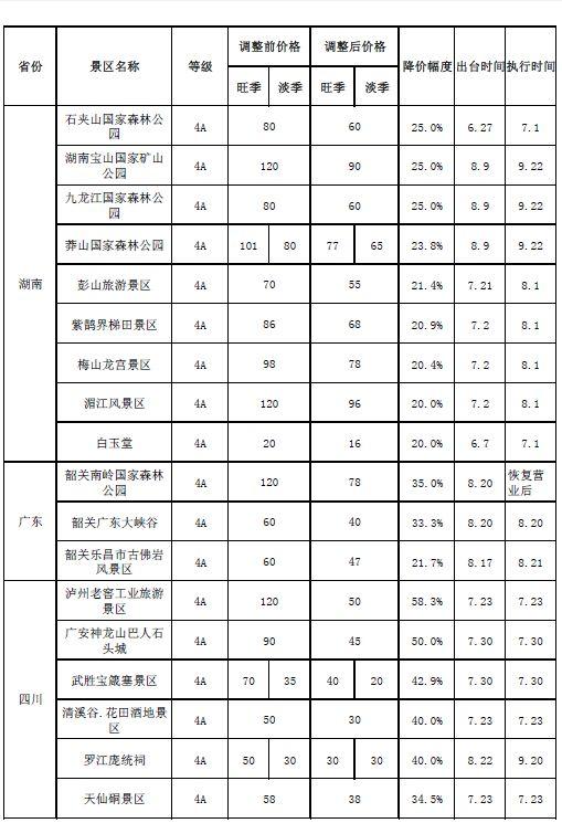 按降價幅度統計,實行免費開放的景區30個,降幅在30%(含30%)以上的29個,在20%(含20%)—30%的48個。