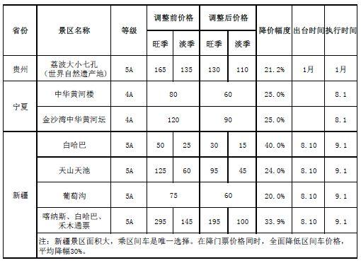 其中,在已經降價的景區中,揚州瘦西湖旺季票價從150元降至100元,華山風景名勝區旺季門票價格由180元降為160元,青島嶗山旺季票價從245元降至180元,黃鶴樓景區門票價格從80元下調至70元,新疆喀納斯、白哈巴、禾木通票旺季票價從295元降至195元,神農頂門票價格由140元調至130元,湖南常德桃花源景區由180元調低至128元,等等。
