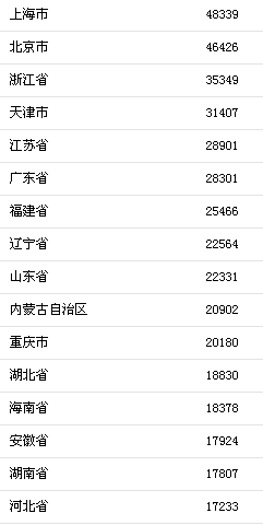 國家統計局公布的31省份居民人均可支配收入顯示,上海、北京、浙江前三季度居民人均可支配收入排名前三。