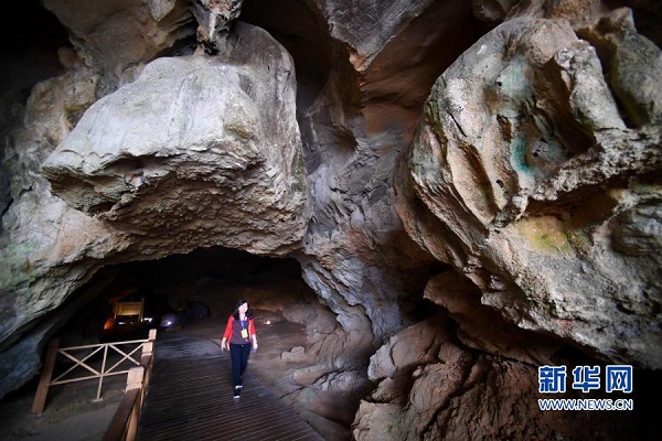 一名參觀者走出位于福建省三明市三元區巖前鎮的萬壽巖國家考古遺址公園船帆洞(11月24日攝)。新華社記者 姜克紅 攝
