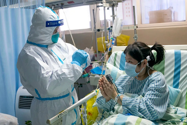 2020年1月24日,在湖北省武漢大學中南醫院重癥隔離病房,中南醫院重癥醫學科主任彭志勇(左)與病情好轉的患者黃淑麗互道新春快樂。新華社記者 熊琦 攝