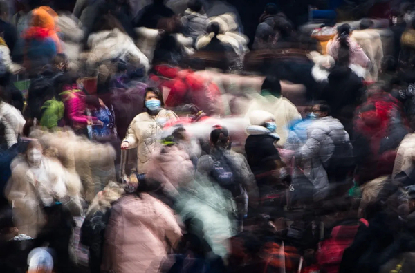 2020年1月22日,在湖北省武漢市漢口火車站,旅客戴口罩進站乘車。1月23日,武漢宣布暫時關閉離漢通道,在全國鼎力支持下,進入“隔一座城、護一國人”的攻堅階段。新華社記者 肖藝九 攝