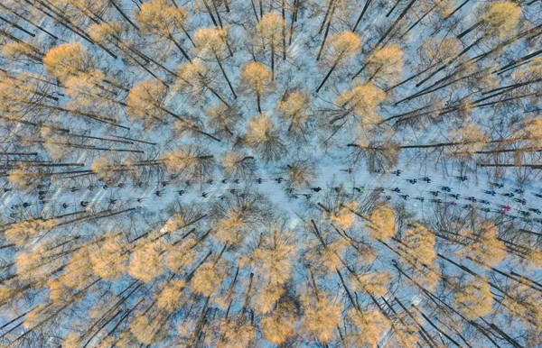 2020年1月4日,參賽選手在2020中國長春凈月潭瓦薩國際滑雪節暨2020國際雪聯越野滑雪中國巡回賽長春站比賽中(無人機照片)。新華社記者 許暢 攝