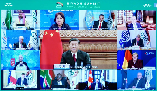 2020年11月22日晚,國家主席習近平在北京以視頻方式出席二十國集團領導人第十五次峰會第二階段會議,重點闡述關于可持續發展問題的看法。新華社記者 饒愛民 攝