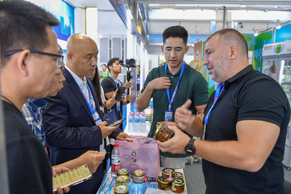 2023年8月23日,在第十四屆中國—東北亞博覽會東北亞商品館,俄羅斯參展商向參觀者介紹商品。