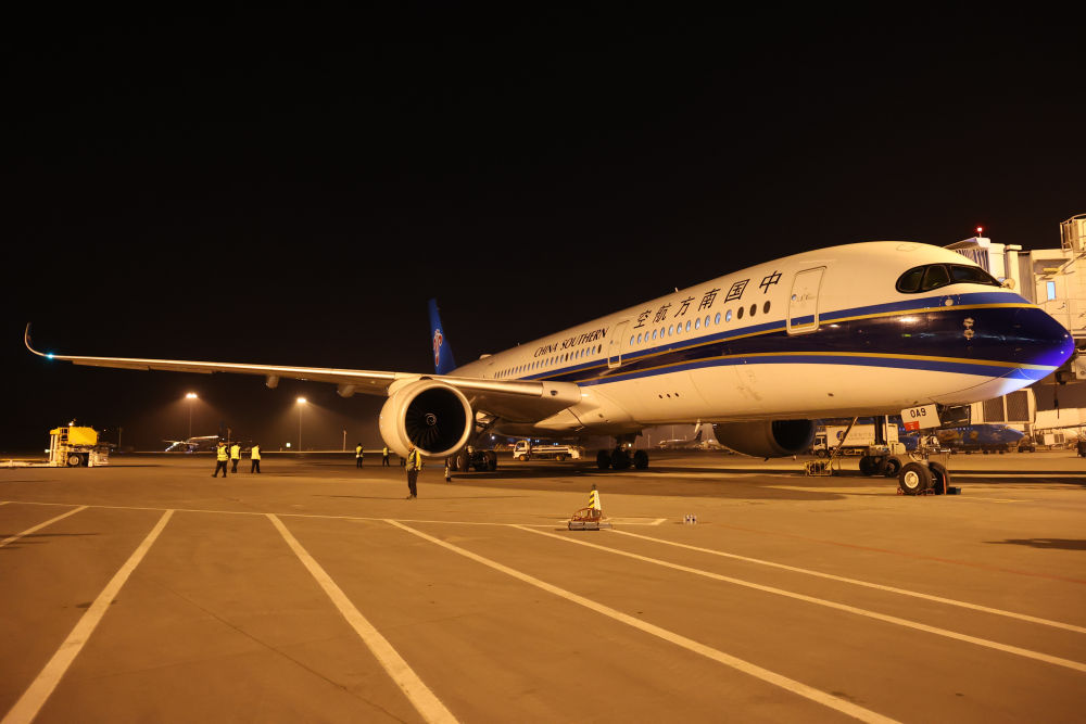 2024年4月24日晚,南航沈陽-法蘭克福CZ8021首航航班在沈陽桃仙國際機場準備起飛。這是國內航司在東北地區開通的首條直飛德國定期航線。