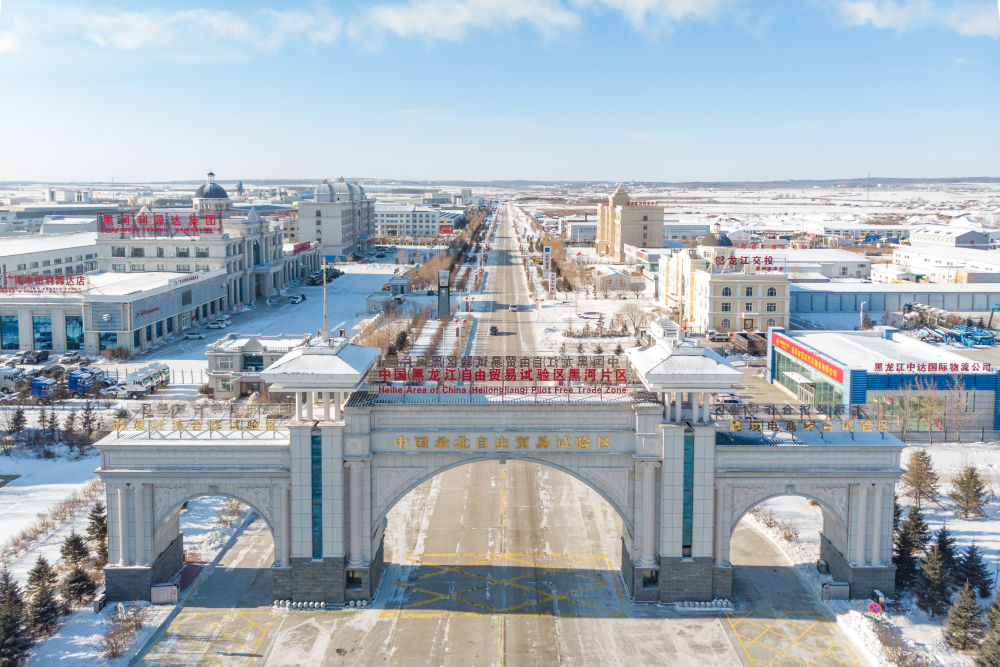 這是2024年1月31日拍攝的中國(黑龍江)自由貿易試驗區黑河片區(無人機照片)。五年來,中國(黑龍江)自由貿易試驗區將“試驗田”種成“高產田”,以全省萬分之三的面積,貢獻了全省約五分之一的實際使用外資和七分之一的外貿進出口,在對外合作、降低物流成本、培育特色產業和新業態新模式等方面深入探索,成功產出超過300項制度創新成果。