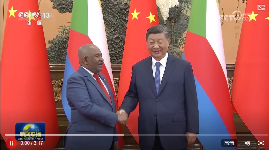 習近平贊賞科摩羅擔任非盟輪值主席國期間發揮的積極作用,指出中方愿同科方秉持和平共處五項原則,在非盟、阿拉伯國家聯盟、伊斯蘭合作組織框架內加強溝通協作,壯大“全球南方”新興力量,推動全球治理體系改革。