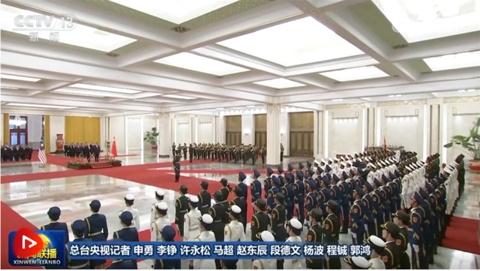 天安門廣場鳴放21響禮炮,禮兵列隊致敬。兩國元首登上檢閱臺,軍樂團奏中馬兩國國歌。易卜拉欣在習近平陪同下檢閱中國人民解放軍儀仗隊,并觀看分列式。