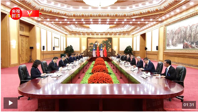 易卜拉欣說:“尊敬的主席閣下,大家好。馬來西亞的外交政策始終堅持同中國發展強勁伙伴關系,馬中兩國共同進步是我們的目標。中國的發展令我印象深刻,這正得益于習近平主席您的領導,以及中國人民的艱苦奮斗。”