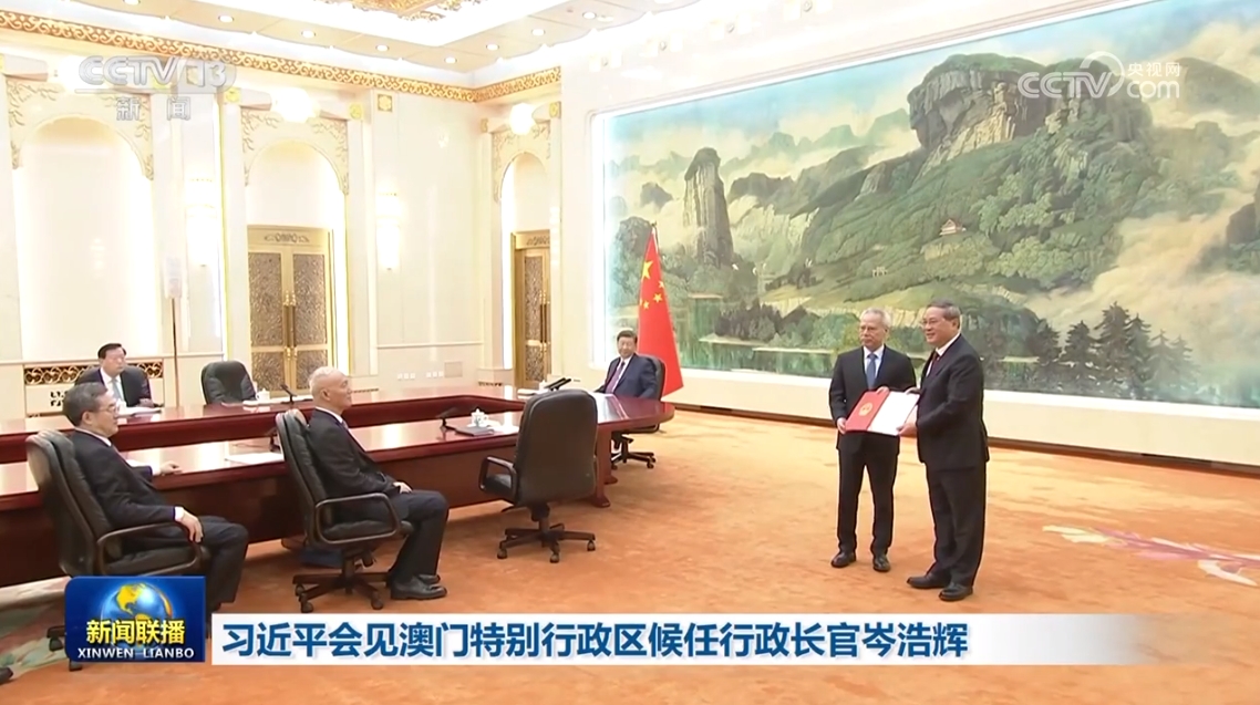 在習近平的見證下,國務院總理李強向岑浩輝頒發(fā)了任命他為中華人民共和國澳門特別行政區(qū)第六任行政長官的國務院第794號令。