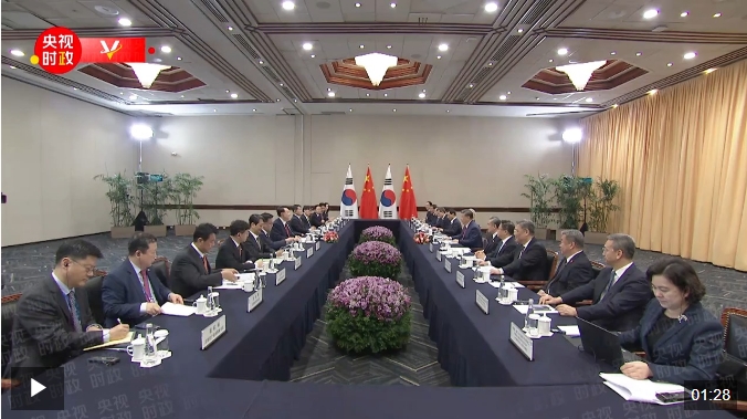 習近平指出,這是2022年巴厘島之后我們時隔兩年再次會晤。過去兩年,國際和地區形勢發生不少變化。無論形勢如何變化,中韓都應該堅守建交初心,堅定睦鄰友好方向,堅持互利共贏目標,發揮地理相鄰、文化相通、經濟相融優勢,加強交流,深化合作,推動中韓戰略合作伙伴關系健康穩定發展,更好造福兩國人民,為促進地區和平穩定和發展繁榮作出更大貢獻。