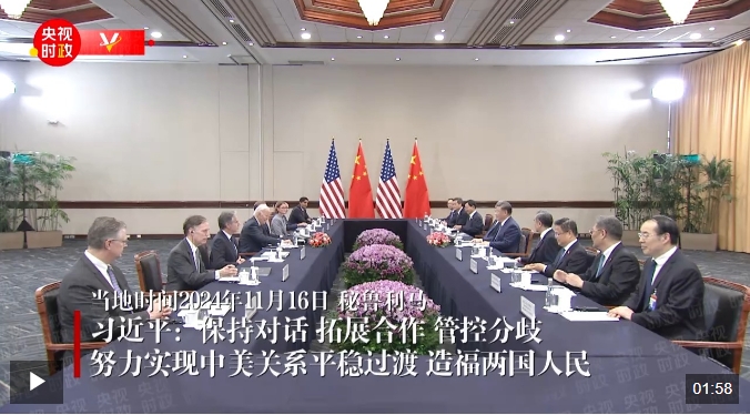 習近平指出,很高興再次同拜登總統先生見面。過去4年,中美關系雖然歷經跌宕起伏,但在我們兩人領航把舵下,也開展了卓有成效的對話和合作,總體實現了穩定。美國剛剛舉行了大選。中方致力于中美關系穩定、健康、可持續發展的目標沒有變,按照相互尊重、和平共處、合作共贏處理中美關系的原則沒有變,堅定維護自身主權、安全、發展利益的立場沒有變,賡續中美人民傳統友誼的愿望沒有變。中方愿同美國政府繼續保持對話、拓展合作、管控分歧,努力實現中美關系平穩過渡,造福兩國人民。