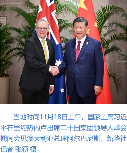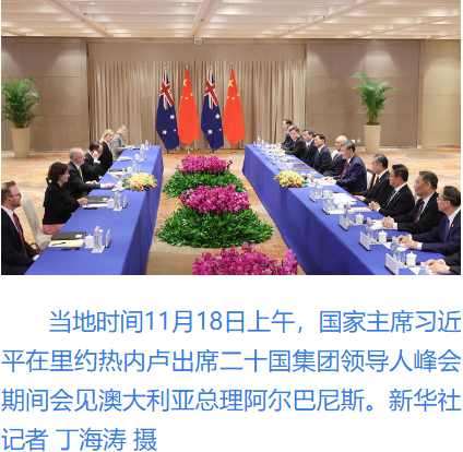 新華社里約熱內盧11月18日電(記者朱超吳昊)當地時間11月18日上午,國家主席習近平在里約熱內盧出席二十國集團領導人峰會期間會見澳大利亞總理阿爾巴尼斯。