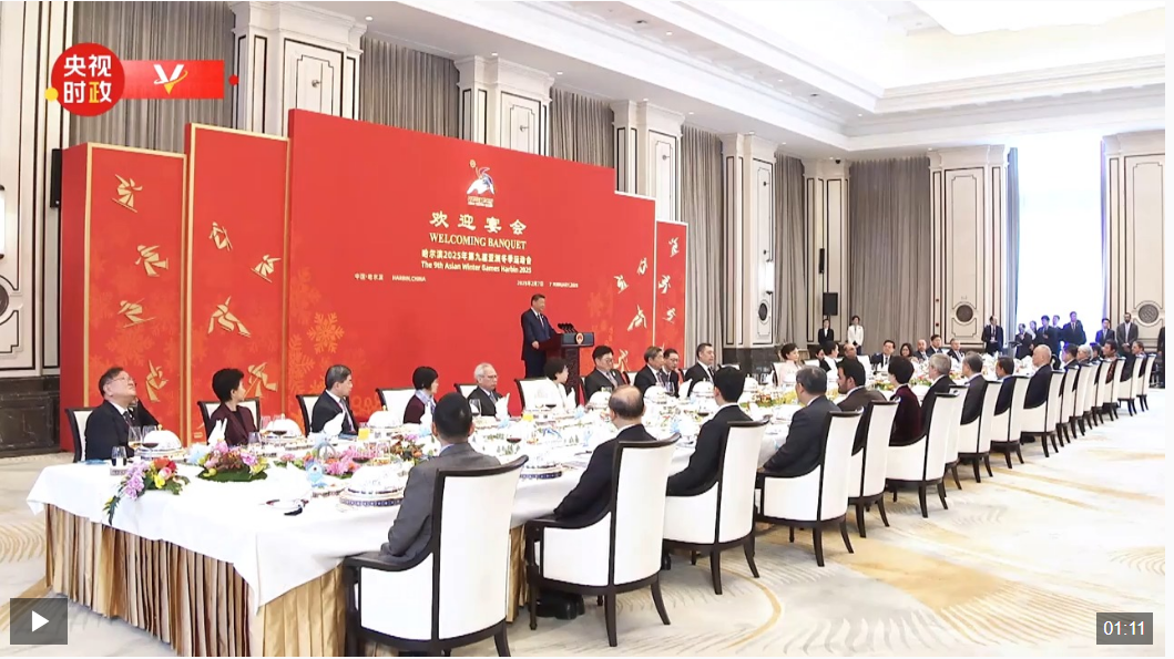 2月7日中午,國家主席習近平和夫人彭麗媛在黑龍江省哈爾濱市太陽島賓館舉行宴會,歡迎來華出席哈爾濱第九屆亞洲冬季運動會開幕式的國際貴賓。
