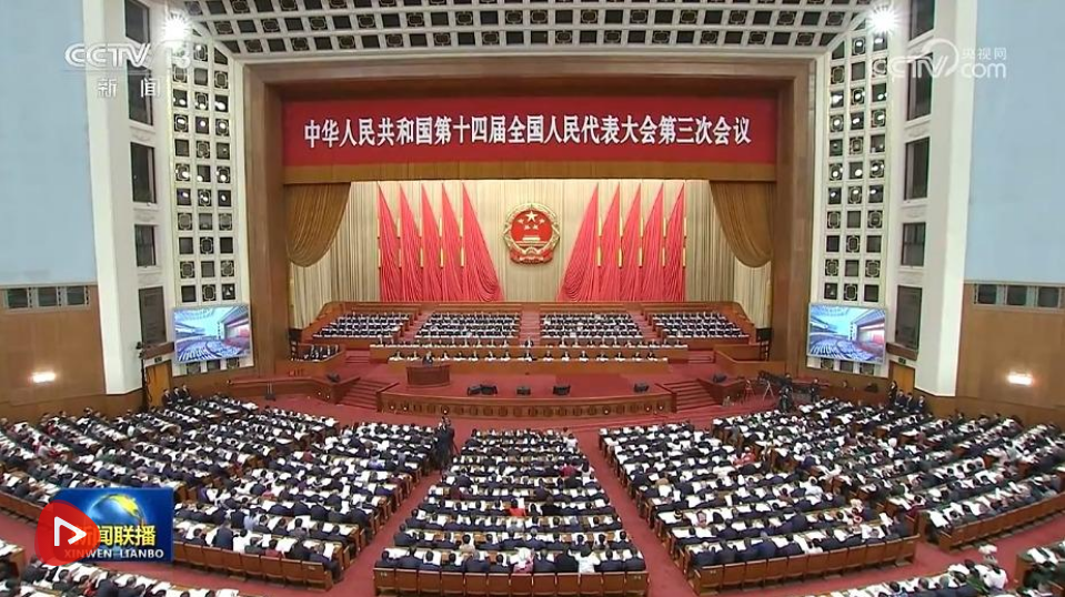 上午9時,趙樂際宣布:中華人民共和國第十四屆全國人民代表大會第三次會議開幕。會場全體起立,高唱國歌。