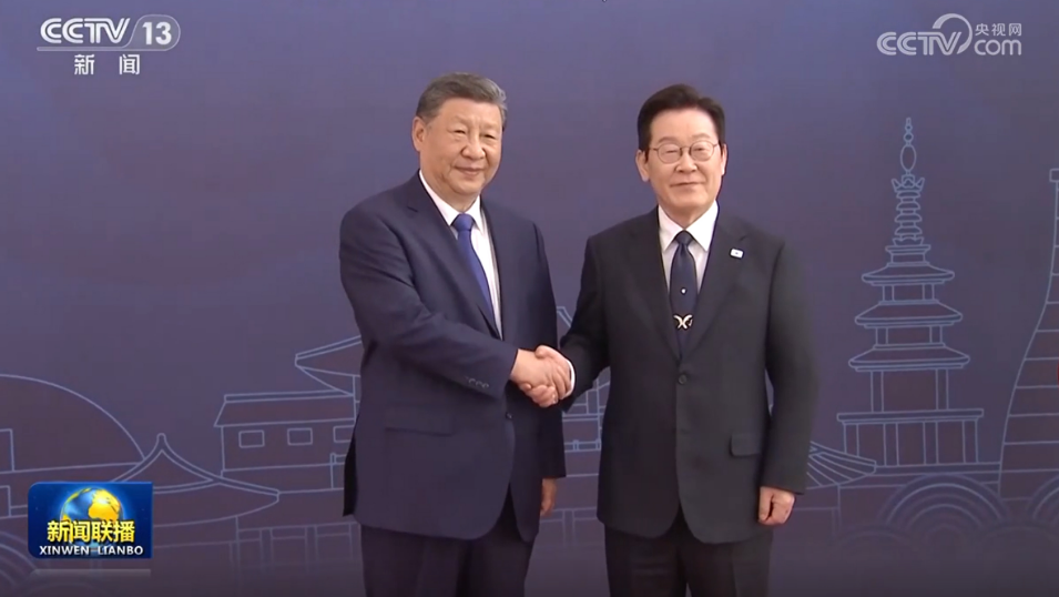 李在明熱情迎接習近平。兩國元首握手合影。
