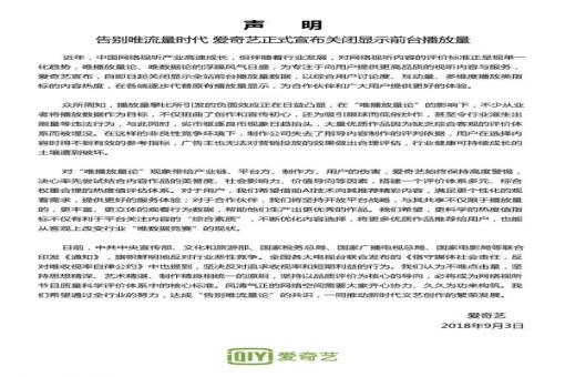 9月3日,愛奇藝發布聲明,宣布正式關閉全站前臺播放量顯示,今后將逐步以內容熱度代替原有播放量。內容熱度包含用戶觀看行為數據、互動行為數據、分享行為等綜合……
