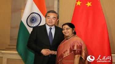 6月4日,國務委員兼外交部長王毅在南非出席金磚國家外長正式會晤期間會見印度外長斯瓦拉杰。 李志偉攝 人民網比勒陀利亞6月4日電 (記者李志偉……