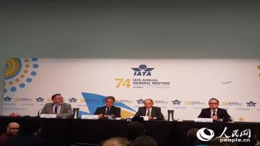 國際航協負責人正在召開記者招待會。 李鋒攝 人民網悉尼6月5日電記者 (李鋒)由澳大利亞航空公司主辦的第七十四屆國際航空運輸協會年會暨世……