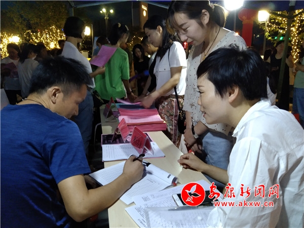 當晚七點,各展位攤前,人來人往,熱鬧非凡,有帶著孩子的婦女為丈夫咨詢的,有老人為自己的兒女詢問的,也有剛畢業的大學生來找合適崗位的,前來咨詢的絡繹不絕。家住城關鎮御景龍城的蔣友愛女士,早早地來到招聘現場,在展位攤前駐足、詢問招聘信息。據她介紹,今天在這里是想給女兒找一個合適的崗位,女兒去年大學畢業,一直呆在西安,最近想回家在家附近找個工作。她表示,今天的崗位多,好多企業開出的工資待遇也還不錯,把招聘信息拿回去拍給女兒看,女兒能留在身邊就業掙錢,還能照顧家里,最好不過啦。