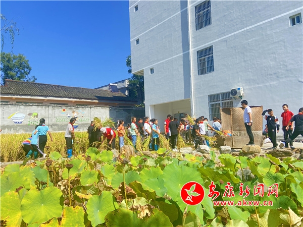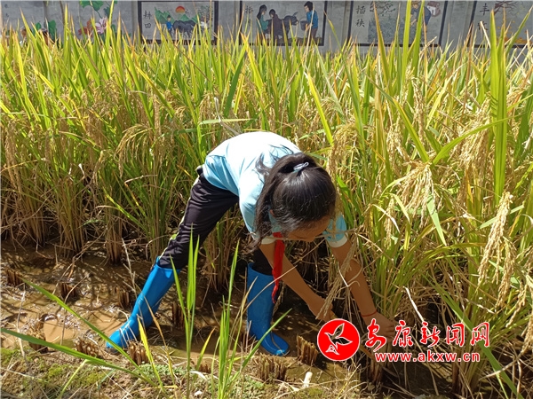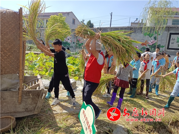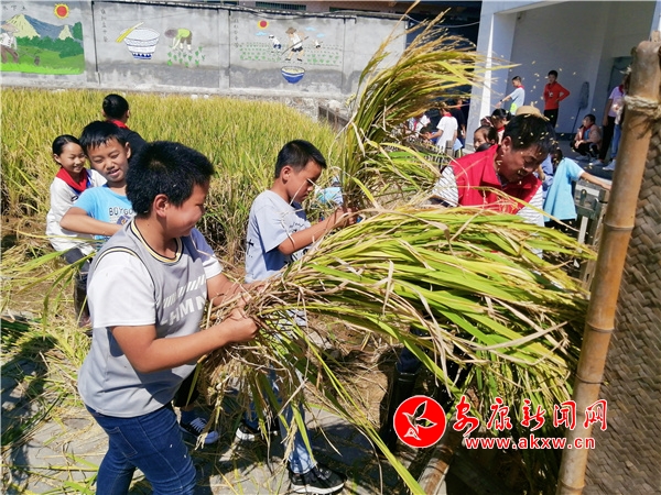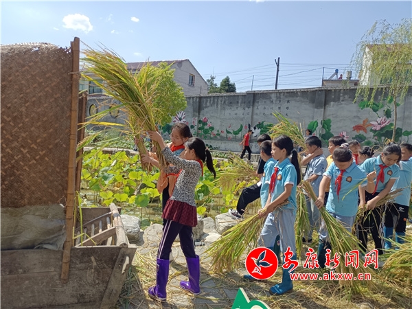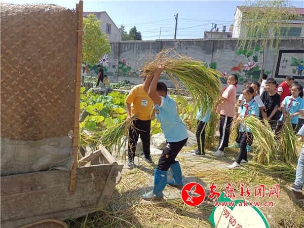 “同學們,你們看那一串串飽滿的稻穗掛在枝頭,長得多喜人吶!現在我們要去收獲自己辛勤耕耘的勞動果實了!大家要認真學習怎樣割稻子,打稻谷,聽從指揮,注意安全……”“老師,我要參與,我不怕累。”“我去年就學會了割稻子,今年我要學會打稻谷!”“我在電視上見過,這個打谷子的工具歷史可悠久了。”
