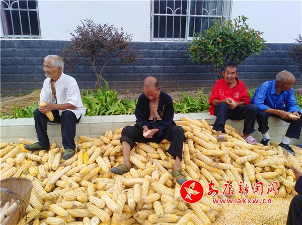 一大早,敬老院的費院長就安排院內2位職工到玉米地組織工人采收玉米。為了安全起見,院內有勞動能力的老人沒有安排外出采收,而是負責在敬老院內組織人員剝玉米、晾曬。工人吆喝著騾子隊拖著一筐筐玉米回到敬老院,李建國等幾個有勞動能力的五保老人就過來搭手,將一筐筐玉米攤放在院場內晾曬。工作人員和其他的五保老人一起,紛紛參與到剝玉米的行列,院場中堆滿了金燦燦的玉米,老人們個個拿著玉米棒子正在脫粒。今年的玉米大豐收,個個玉米棒子顆粒飽滿,顏色金黃誘人。大家忙活著,露出豐收的喜悅。