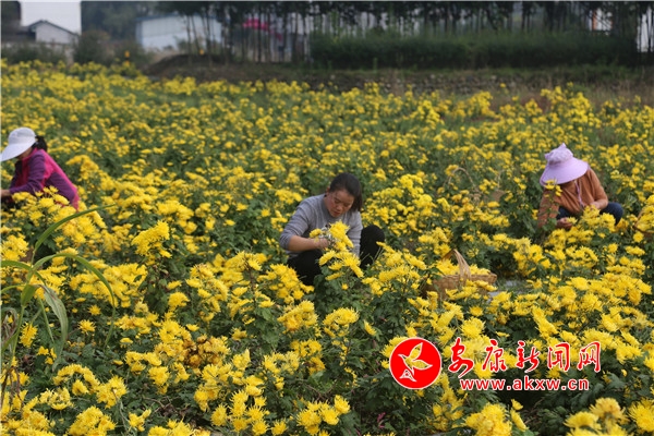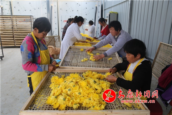 五愛村群山環繞,空氣清新,良好的自然生態環境成為金絲皇菊孕育生長的絕佳之地。最近幾天正值金絲皇菊的盛花期,菊園內,人們趁著好天氣忙著采菊,眉眼里盡顯豐收的喜悅。合作社里,10余名工人正在挑揀、擺放剛采回來的菊花。負責人譚小燕說,這些形態嬌媚,金黃艷麗的金絲皇菊經過72小時的恒溫烘烤,便可成為一款天然健康的飲品:金絲皇菊茶。