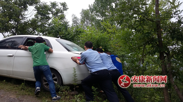 民警趕緊走近查看,把還坐在車上的老人扶下車。由于倒車時沒控制好,車的右后輪已全部懸在空中,一棵小樹檔在車后尾,加之車后尾下沉車體已擔在路基上,這樣車子才沒有從上邊公路跌至坎下公路。民警立即找來堅硬的石塊,分別墊在車前輪和左后輪處,將車子支牢固定,使其不能再向下滑動。然后,用千斤頂將右邊車身支起,在右后輪處支上較大石塊,使懸空車輪可以著力。一切就緒好,駕駛經驗豐富的民警負責駕駛,其余人員從車后尾處推車,大家齊心協力,一股作氣將車子從坎崖邊推了上來。YGJ安康新聞網