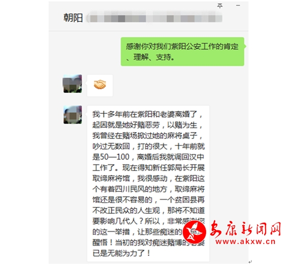8月7日8時(shí)25分,紫陽縣公安局新媒體中心接到電話號(hào)碼為1589166****的漢中籍男士打來的電話,在電話里,該男士非常激動(dòng)的對(duì)紫陽縣公安局作出的開展貧困村麻將館、棋牌室集中整治專項(xiàng)行動(dòng)贊不絕口,該男士在電話里訴說:“我是漢中人,有正式工作,也是紫陽女婿,多年前和媳婦一起住在紫陽,紫陽是個(gè)好地方,但是,就是賭博之風(fēng)太嚴(yán)重了,媳婦一度沉迷賭博,屢次勸說不聽,一場(chǎng)牌局下來,少則輸幾千,多則輸幾萬,幾年下來,殷實(shí)的家庭四處舉債,一度舉步維艱,迫不得已,和媳婦離了婚,傷心之余,將工作調(diào)回了漢中。前幾天,在網(wǎng)上看到了紫陽縣公安局發(fā)出的禁賭通告,覺得非常好,要脫貧,就要先禁賭,特別感謝郭書記!這次禁賭行動(dòng),是給那些喜好賭博的人敲響了警鐘,告誡那些沉迷賭博的人:應(yīng)該把精力放在脫貧致富、建設(shè)美好家園上,沉迷賭博,害人害已。”