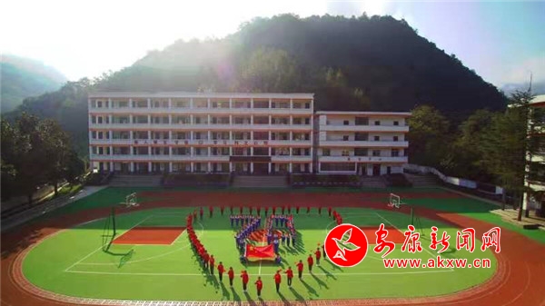 幾十名身穿藍色班服的學生在操場正中央排成數字“70",在數字正前面,四名同學展開國旗,然后,數十名身穿紅色班服的學生在外圍圍成"心"形。"70",象征著70周年,"心"型, 寓含著孩子們對偉大祖國的熱愛。整個造型寓意深刻,活動表現形式新穎獨特,令人耳目一新。