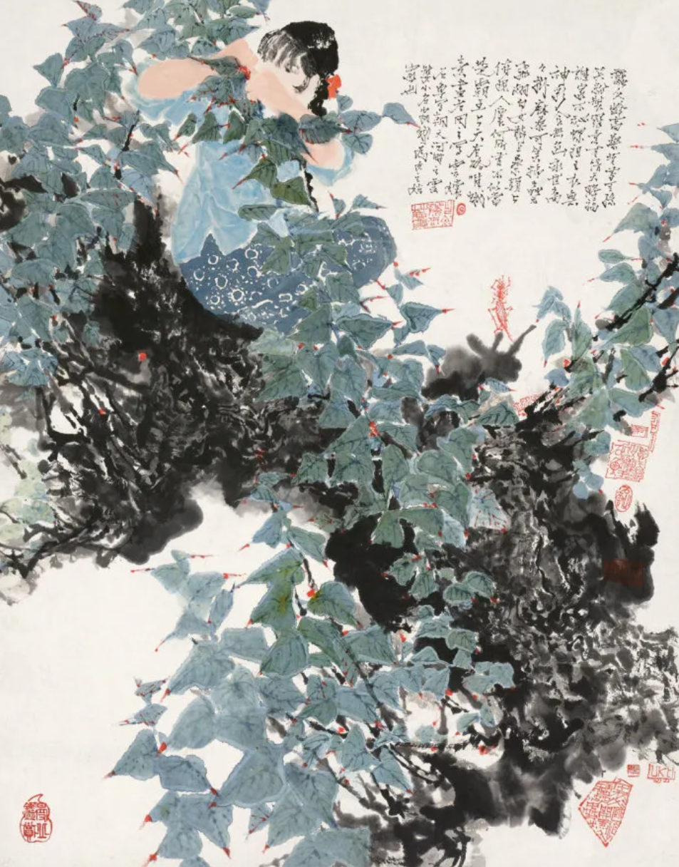 題識:蠶女齡喬桑,昔有王孫笑粉妝。羅素有情天降福,誰家不秘王祖。衣無神采食無魚,永世商裔掛麻桑。可笑棉蟲無飛翅,白女敢上桑顛上。俯視人寰何所有,不似當(年)楚霸王。上天有路唯蛾素,畫者因之寫云。石魯寫朝天河畔之云婆,小名安蛾,為女之姑家也。《采桑圖》,2010春拍成交價1064萬元。